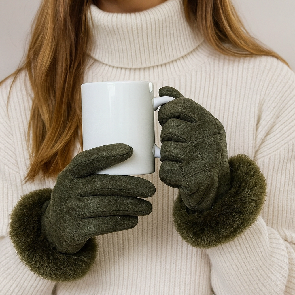 Army Green gloves with fur trim