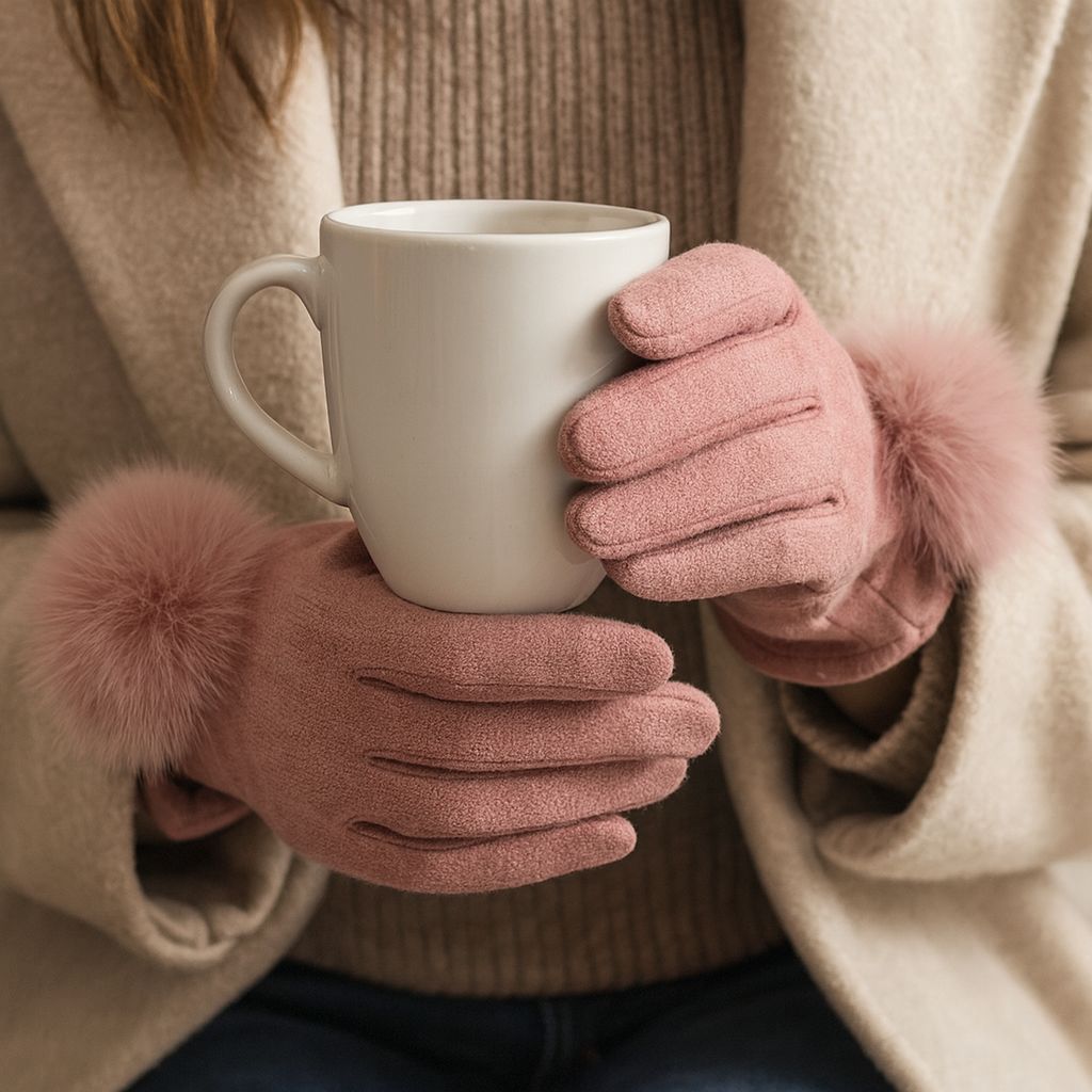 Pink Suedette gloves with Fur Pom Poms