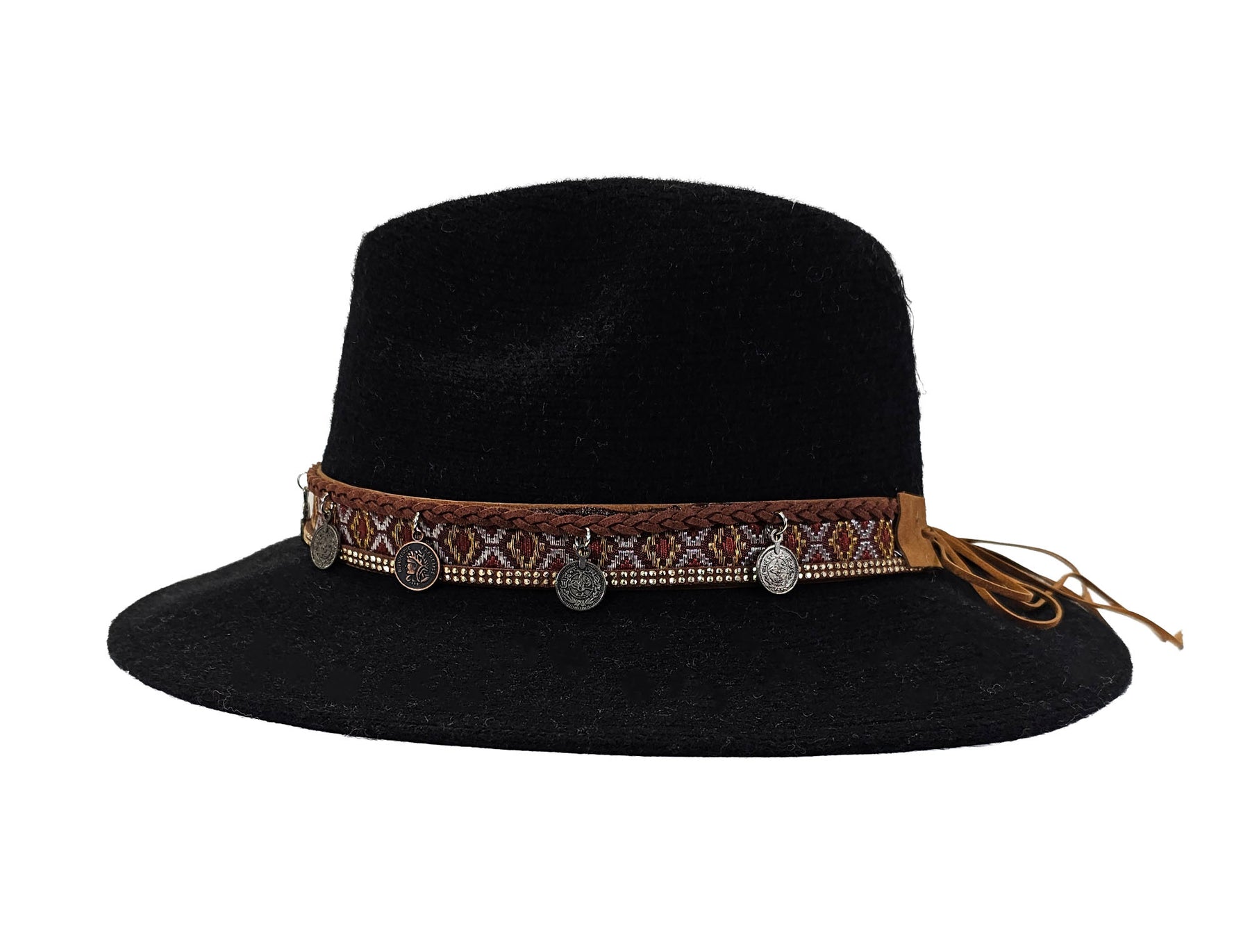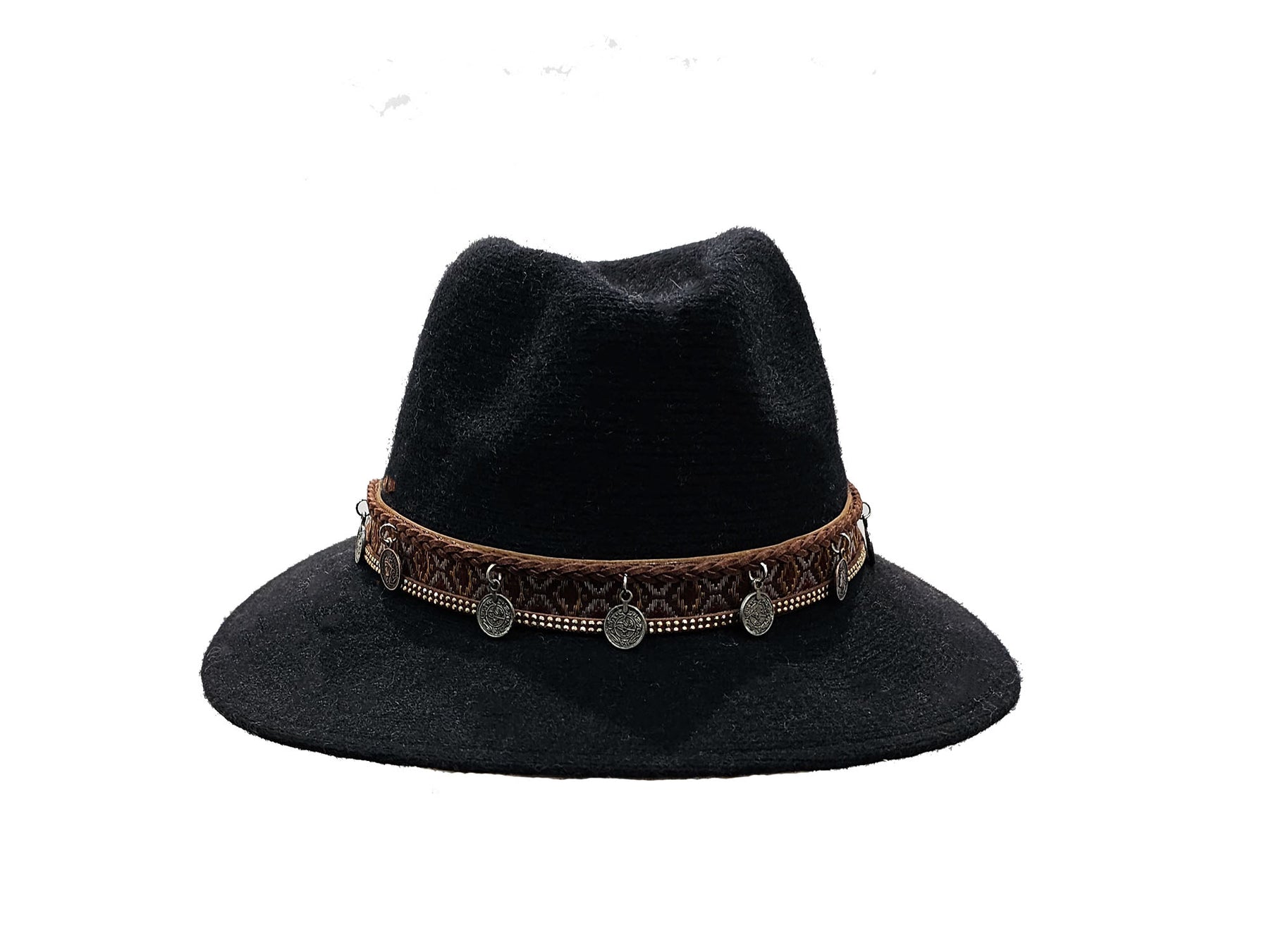 A statement-making black fedora hat with a soft felt finish and a classic, gently tapered crown. This design stands out with its intricately crafted boho-inspired brown band, featuring woven detailing, metallic bead accents, and dangling antique-style coin charms that add movement and character. The hat’s wide, relaxed brim completes the rustic-chic look, making it the perfect accessory for festivals, travel, casual outings, or elevating everyday style. Versatile, eye-catching, and full of personality — this fedora brings a unique bohemian flair to any wardrobe.