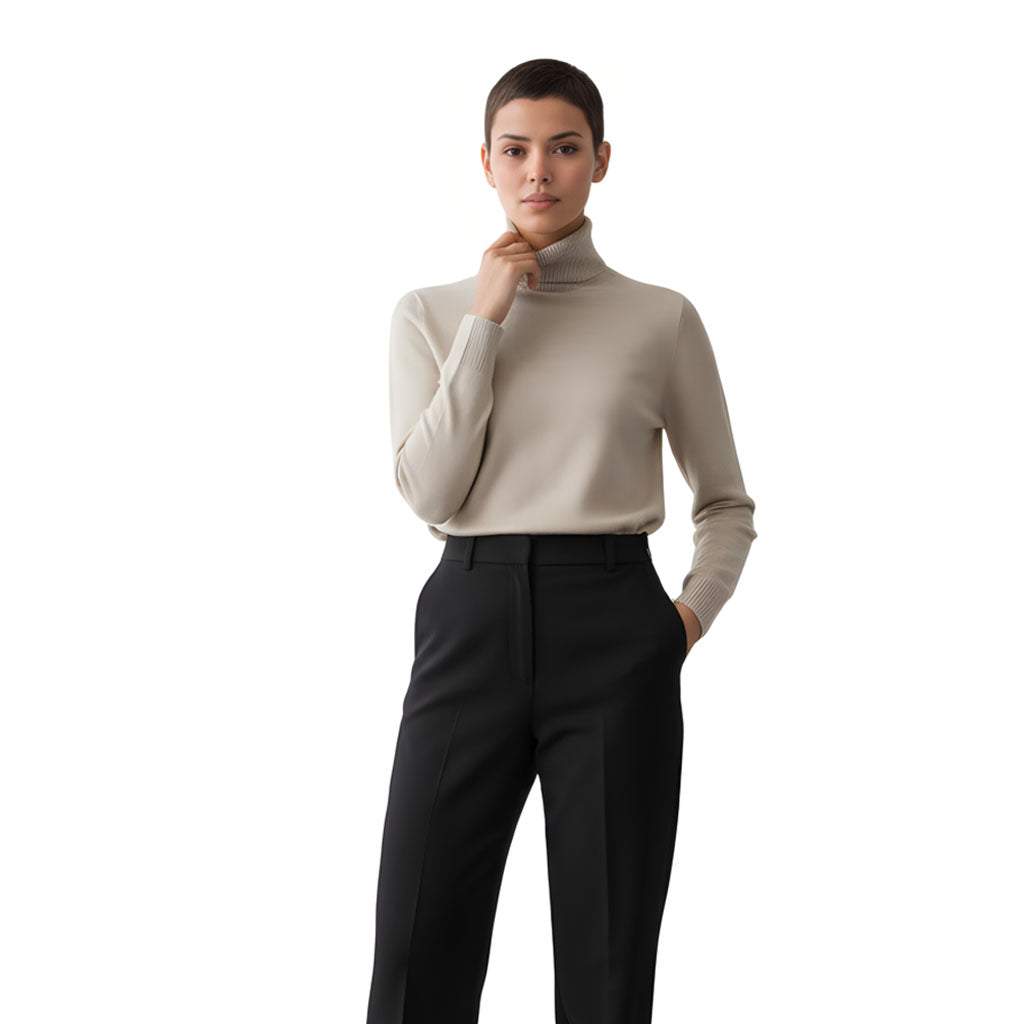 Product Description and Fit: This elegant brown turtleneck sweater features a classic design with long sleeves and a high neckline. The garment fits close to the body, offering a sleek and stylish appearance suitable for various occasions.