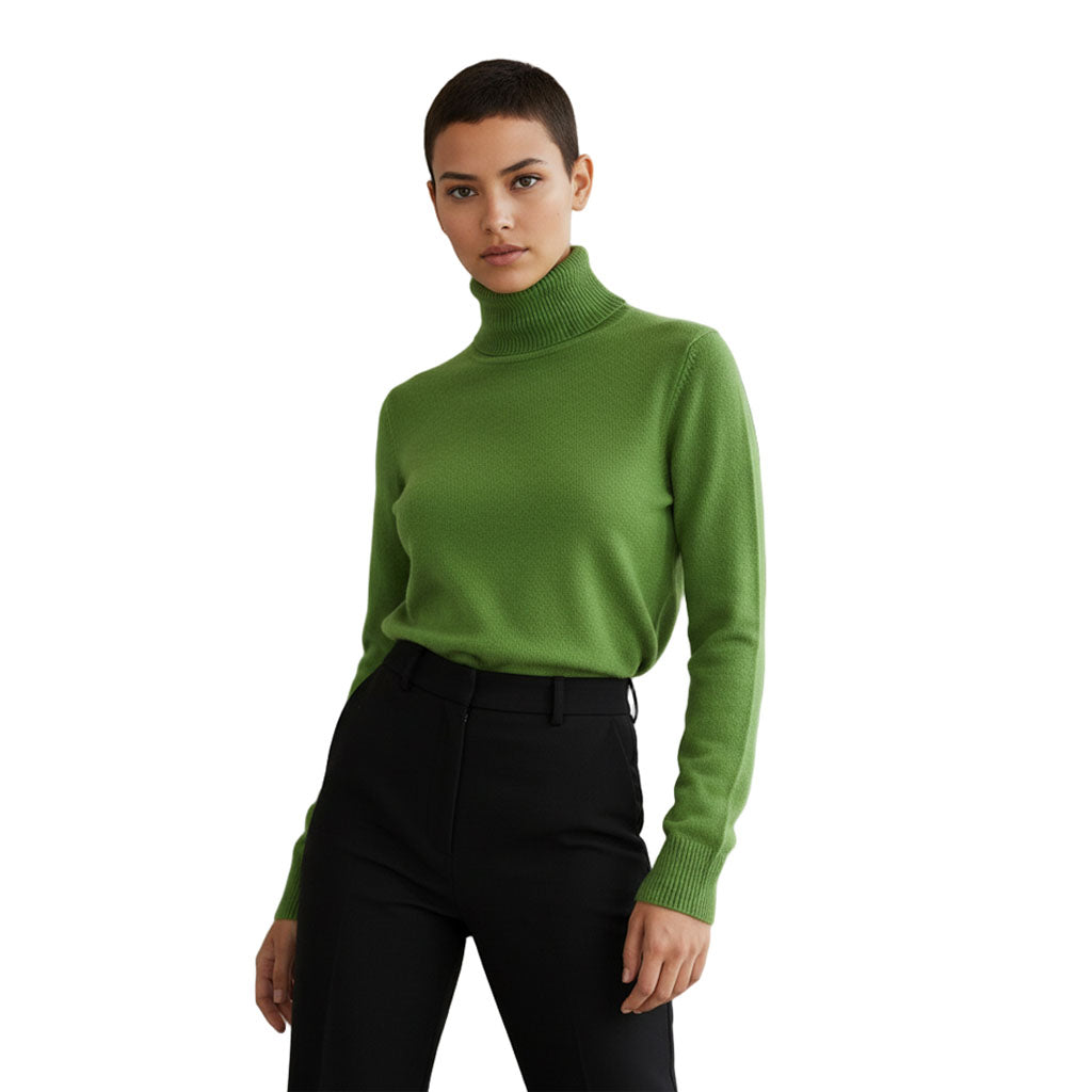 • Product Description and Fit: This elegant dark green turtleneck sweater features a classic design with long sleeves and a high neckline. The garment fits close to the body, offering a sleek and stylish appearance suitable for various occasions.