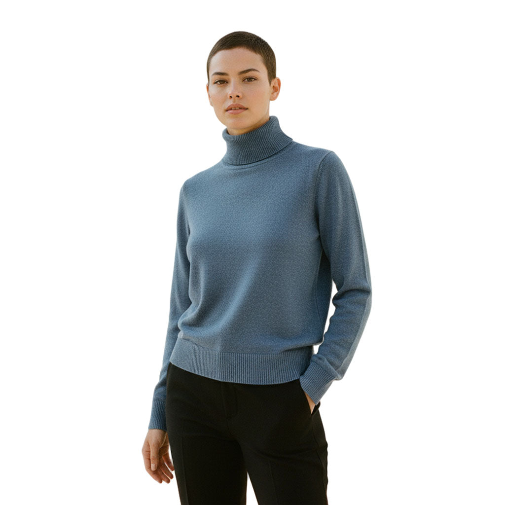 Product Description and Fit: This elegant blue turtleneck sweater features a classic design with long sleeves and a high neckline. The garment fits close to the body, offering a sleek and stylish appearance suitable for various occasions.