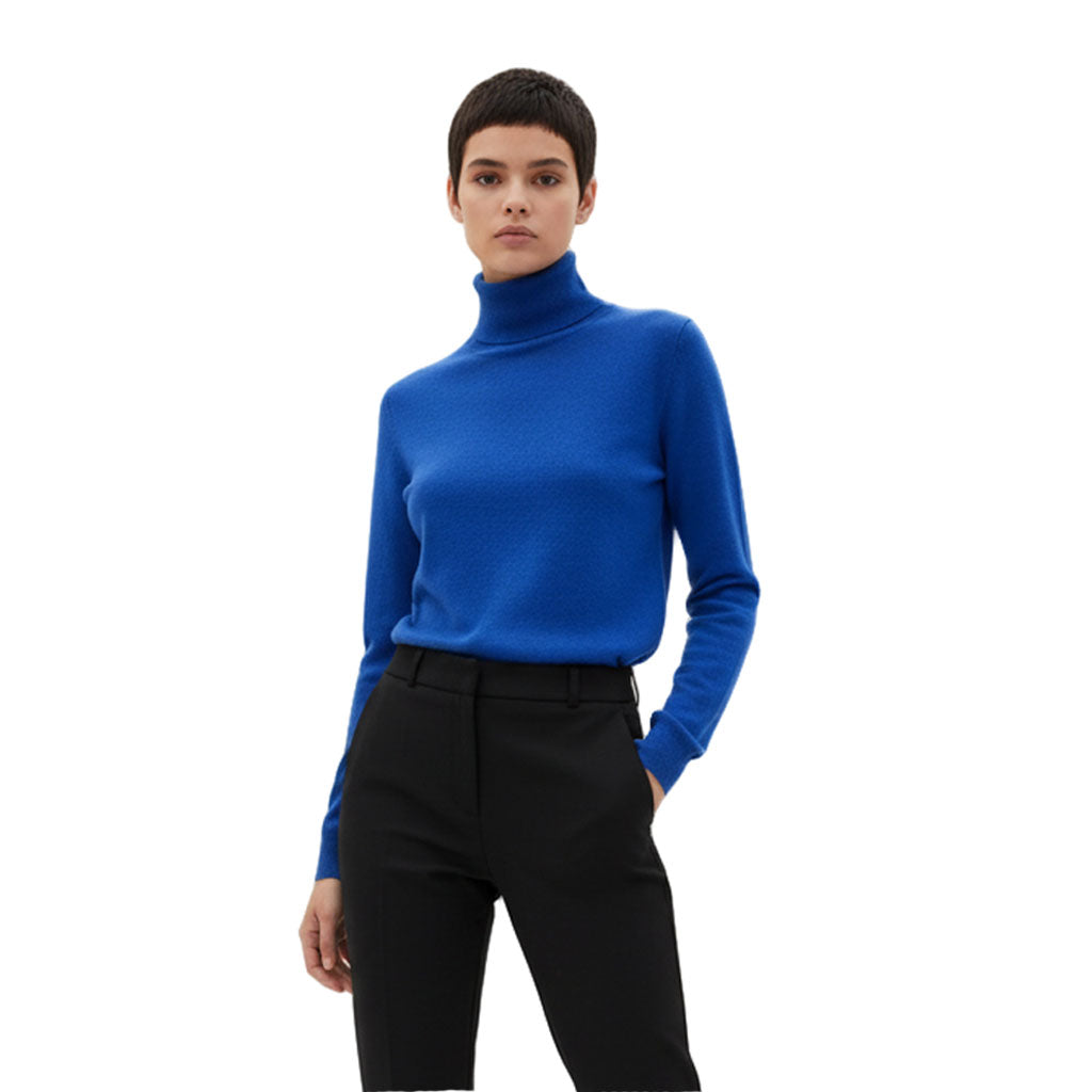 Product Description and Fit: This elegant royal blue turtleneck sweater features a classic design with long sleeves and a high neckline. The garment fits close to the body, offering a sleek and stylish appearance suitable for various occasions.