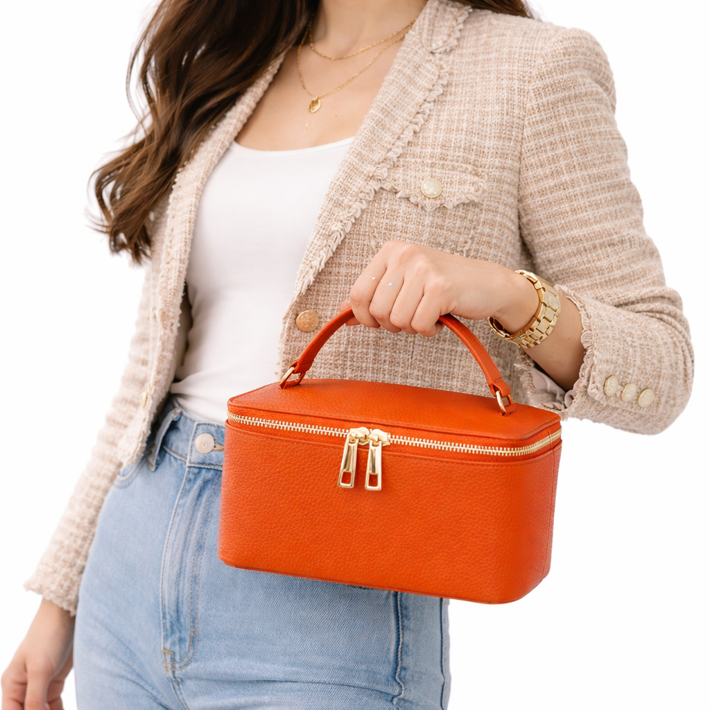 Outer material : Genuine leather Internal: Fabric & faux leather lining Interior pocket and card holderOutside: zip closure Removable leather shoulder strap