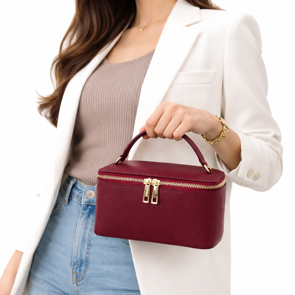 Outer material : Genuine leather Internal: Fabric & faux leather lining Interior pocket and card holderOutside: zip closure Removable leather shoulder strap